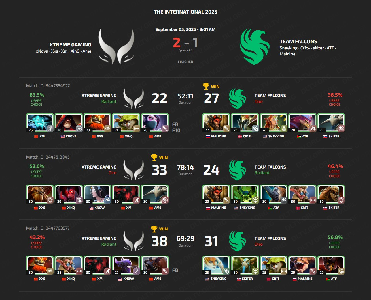 Xtreme Gaming and Team Falcons played a five-hour bo3, in which Xtreme Gaming emerged as the winners. The teams showed the highest level of Dota. All maps were extremely even, but the drafts of Xtreme Gaming proved to be stronger twice in the late game.