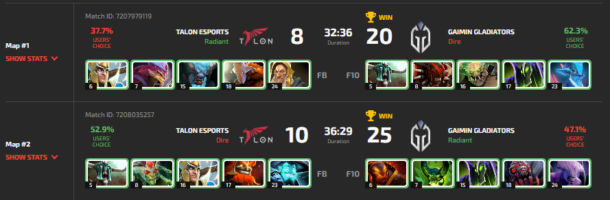 На первой карте «гладиаторы» взяли сигнатурного Leshrak для Квина 'Quinn' Каллахана и Bloodseeker для Антона 'dyrachyo' Шкредова. Talon сыграли с Pangolier и Juggernaut, а также с Kotl на третьей позиции. Успеха им это не принесло. GG выиграли все свои линии и к 20 минуте вели десять тысяч золота. Получив ауры на Underlord, «гладиаторы» поднялись на хайграунд, а Talon никак не смогли им помешать. Легкая победа для Gaimin Gladiators - 1:0.