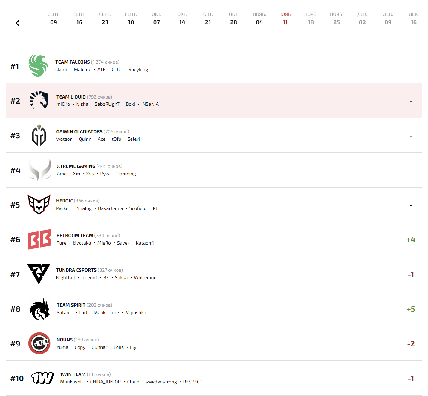 Первое место заслуженно занимают Team Falcons, которые подняли кубок на DreamLeague Season 24 и BetBoom Dacha Belgrade 2024, а также заняли второе место на PGL Wallachia Season 2. Решение не менять состав во время периода решафлов оказалось верным. Следом за ними идут Team Liquid, пополнившие свою коллекцию еще одной Эгидой. Правда, после ухода ключевого игрока, 33, результаты команды заметно ухудшились. На третьей строчке расположились Gaimin Gladiators, которые выиграли Riyadh Masters 2024 и заняли второе место на The International 2024. Замена одного игрока, как и в случае с Team Liquid, сильно повлияла на стабильность состава. Четвертыми стали Xtreme Gaming, держащиеся в топе за счет достижений в прошлом сезоне. Пятерку лучших замыкают Heroic, одолевшие Team Falcons в финале PGL Wallachia Season 2