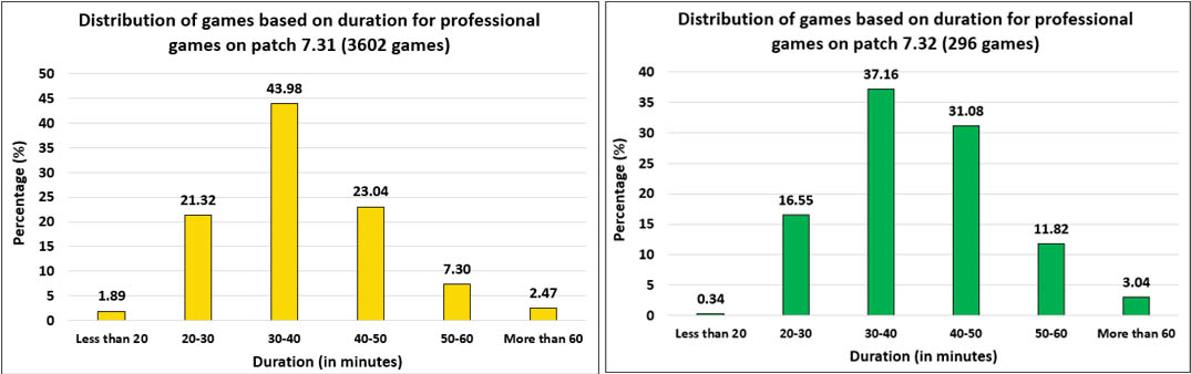 Пользователь Reddit под ником gopya23 сделал сравнительный анализ матчей профессиональной сцены. Так, практически половина матчей нового патча длится от 40 минут и более. В прошлом патче этот показатель составлял 32.8%.