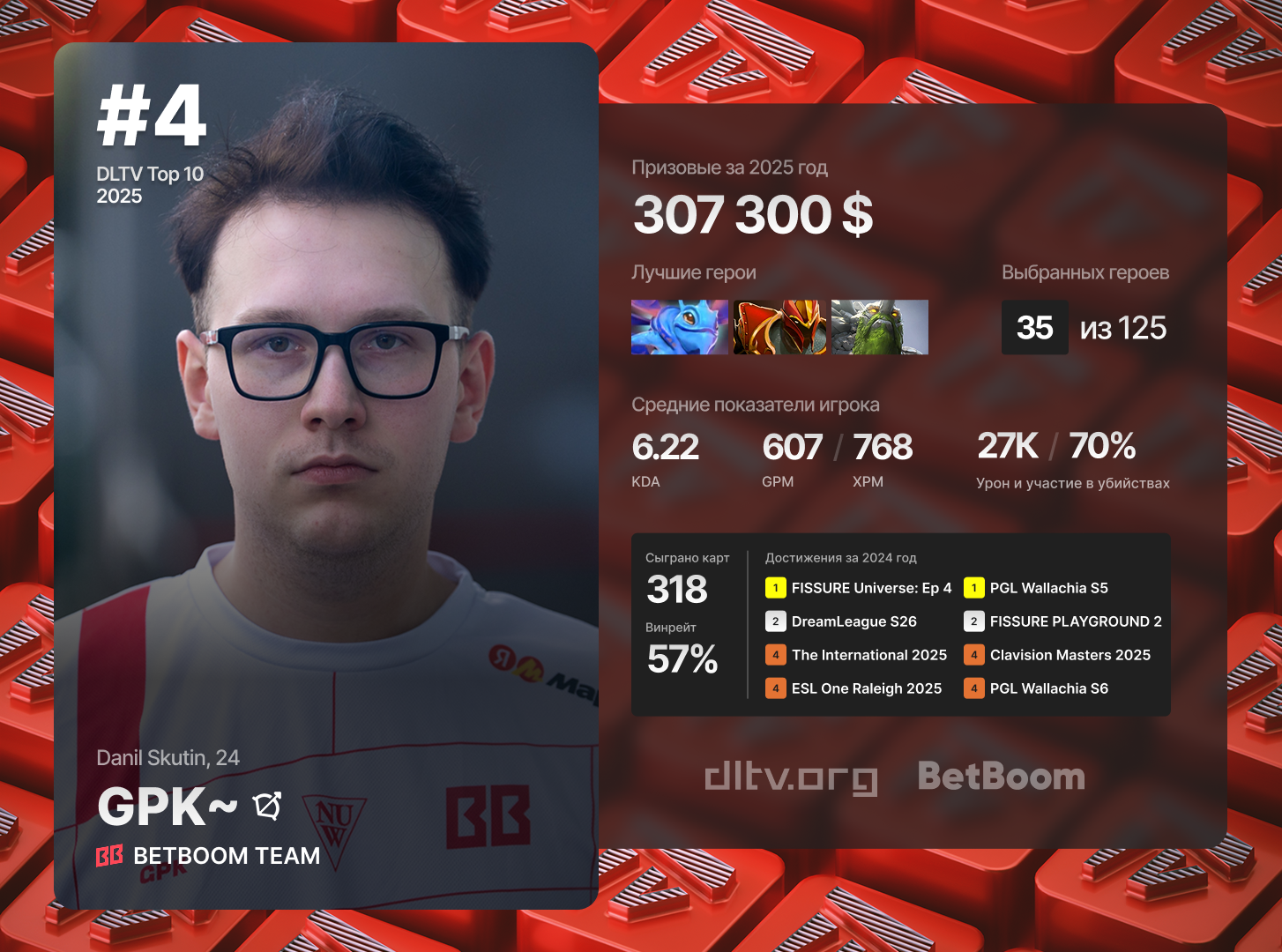 In 2025 gpk~ significantly improved his already impressive individual statistics. Throughout the season he was repeatedly called the strongest midlaner. For gpk~ the notion of «lost lane» practically did not exist - in most matches it was gpk~ who dominated and outclassed his opponents thanks to his outstanding individual skill. For his performance at PGL Wallachia Season 5 gpk~ was recognized as the MVP of the tournament, showing an average KDA of 7.03. Over 318 maps played in 2025, gpk~ used 35 heroes, demonstrating one of the widest hero pools among midlaners. His best hero was Puck - 41 maps played, a 51% win rate and an impressive KDA 8.07. Thanks to victories and high placements at tournaments, gpk~ earned more than 300 thousand dollars in prize money.