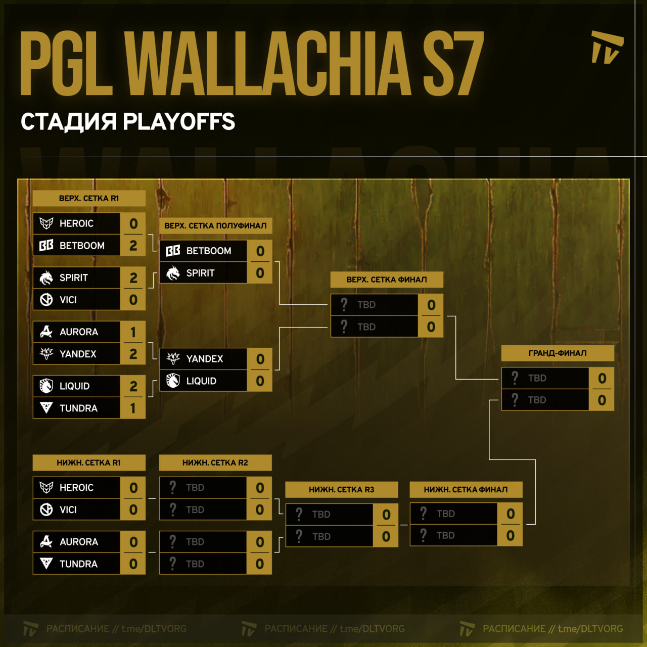 The first day of the playoffs of PGL Wallachia Season 7 has come to an end. Team Spirit, BetBoom Team, Team Liquid and Team Yandex advanced to the upper bracket semifinals.